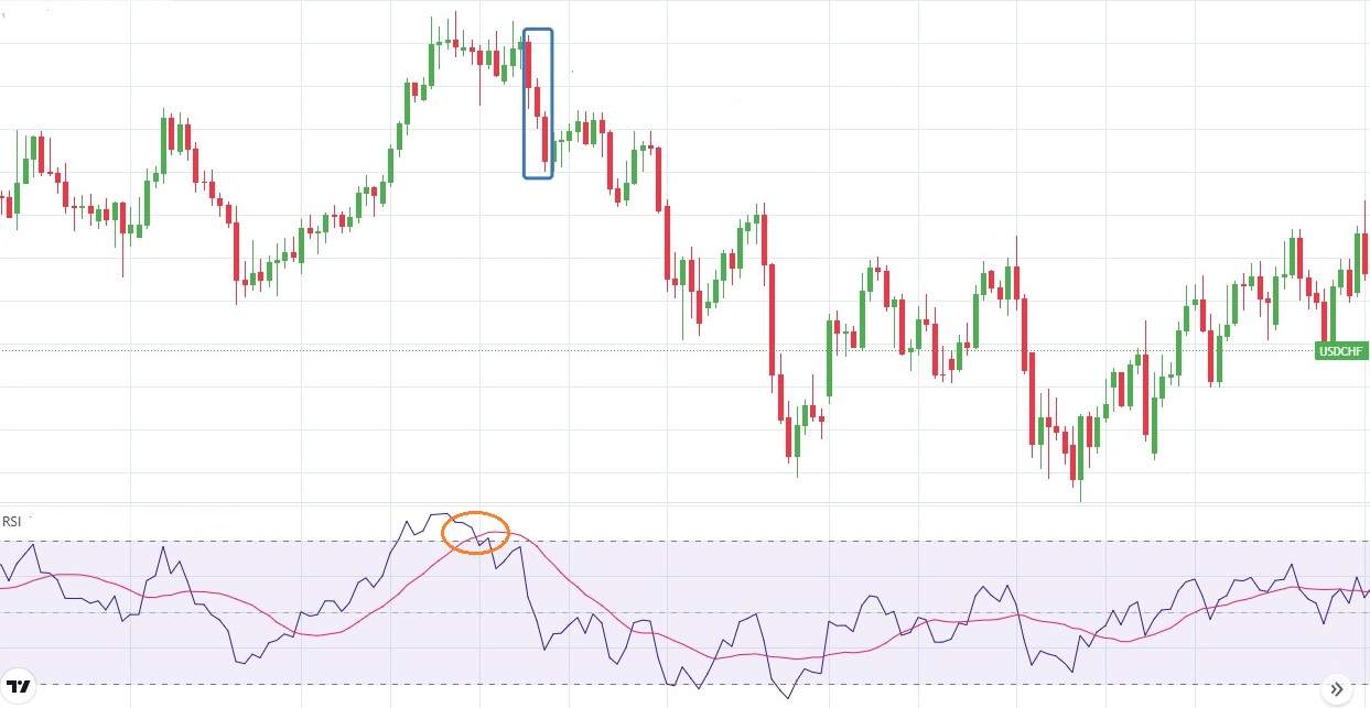 - Chỉ báo RSI: Tín hiệu mạnh khi RSI xuất hiện phân kỳ giảm (giá tạo đỉnh cao hơn nhưng RSI tạo đỉnh thấp hơn) hoặc thoát khỏi vùng quá mua. Điều này cho thấy động lực tăng đã suy yếu, hỗ trợ mạnh mẽ cho sự đảo chiều từ mô hình nến.