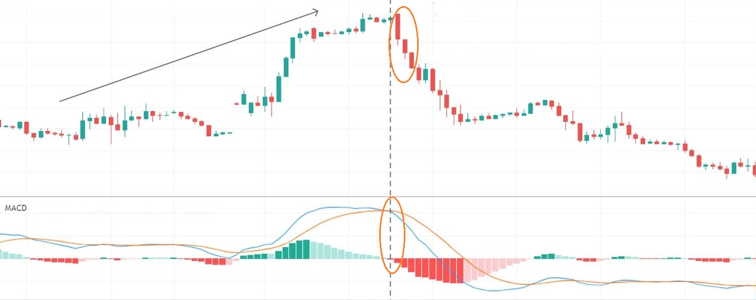 - Chỉ báo MACD: Xác nhận xu hướng giảm khi đường MACD cắt xuống dưới đường signal, hoặc histogram chuyển từ dương sang âm và mở rộng. Những yếu tố này cho thấy đà giảm đang tăng tốc, phù hợp với áp lực bán thể hiện qua mô hình nến.