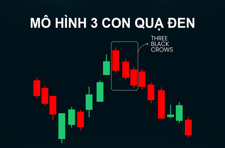 Ba con quạ đen (Three Black Crows) là mô hình nến Nhật gồm ba cây nến giảm liên tiếp, mỗi nến thường đóng cửa thấp hơn nến trước đó. Đây là tín hiệu đảo chiều giảm mạnh, thường xuất hiện sau một xu hướng tăng hoặc giai đoạn thị trường đi ngang có dấu hiệu suy yếu.