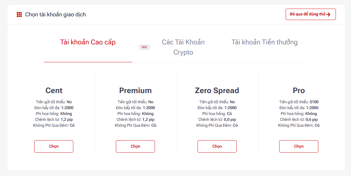 - Tài khoản đa dạng: Từ tài khoản Cent không yêu cầu nạp tối thiểu đến tài khoản Pro cho trader chuyên nghiệp, đáp ứng mọi nhu cầu giao dịch.