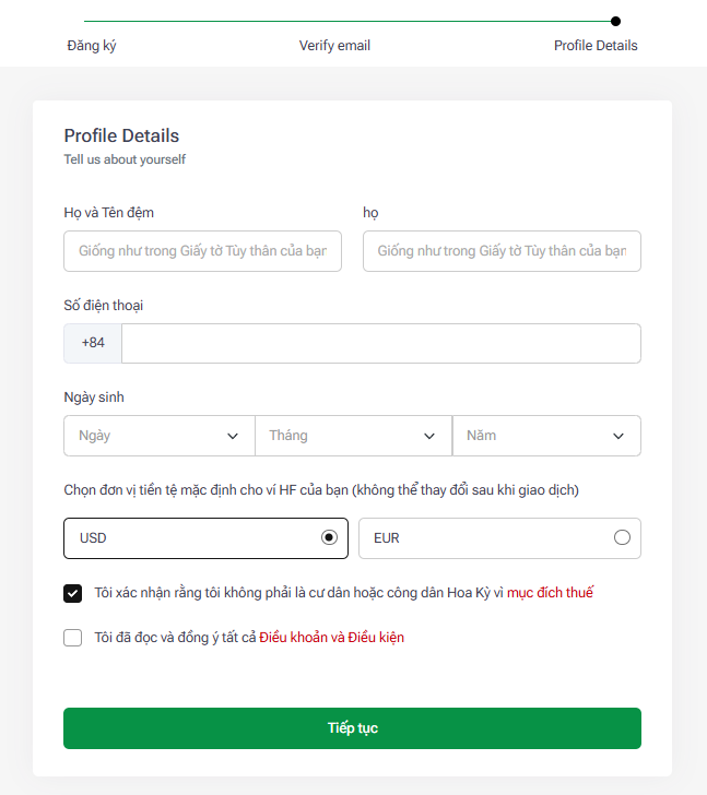 - Hoàn tất các thông tin bổ sung cần thiết để mở tài khoản của bạn. Chấp nhận các điều khoản và điều kiện một lần nữa và nhấp vào nút “Tiếp tục” .