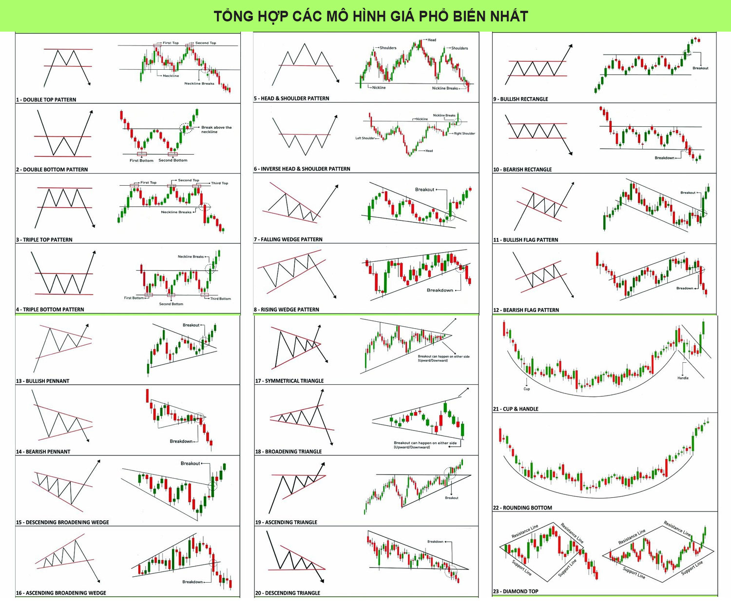Bài viết này tổng hợp các mô hình giá phổ biến nhất trong Forex, phân tích đặc điểm kỹ thuật và cách giao dịch cơ bản.