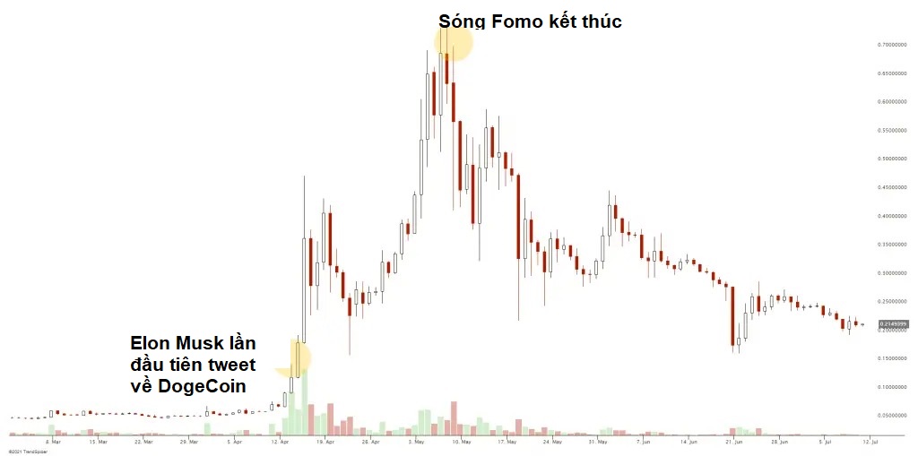 Biểu đồ DogeCoin dưới đây là một ví dụ về việc “mua tin đồn, bán sự thật”: đợt tăng giá bắt đầu khi Elon Musk lần đầu tiên đăng tweet về DogeCoin vào ngày 14/4/2021, khởi nguồn cho những tin đồn, và kết thúc khi Elon xuất hiện trực tiếp trên chương trình Saturday Night Live vào ngày 8/5/2021 — lúc đó tin tức đã được lan truyền trọn vẹn.