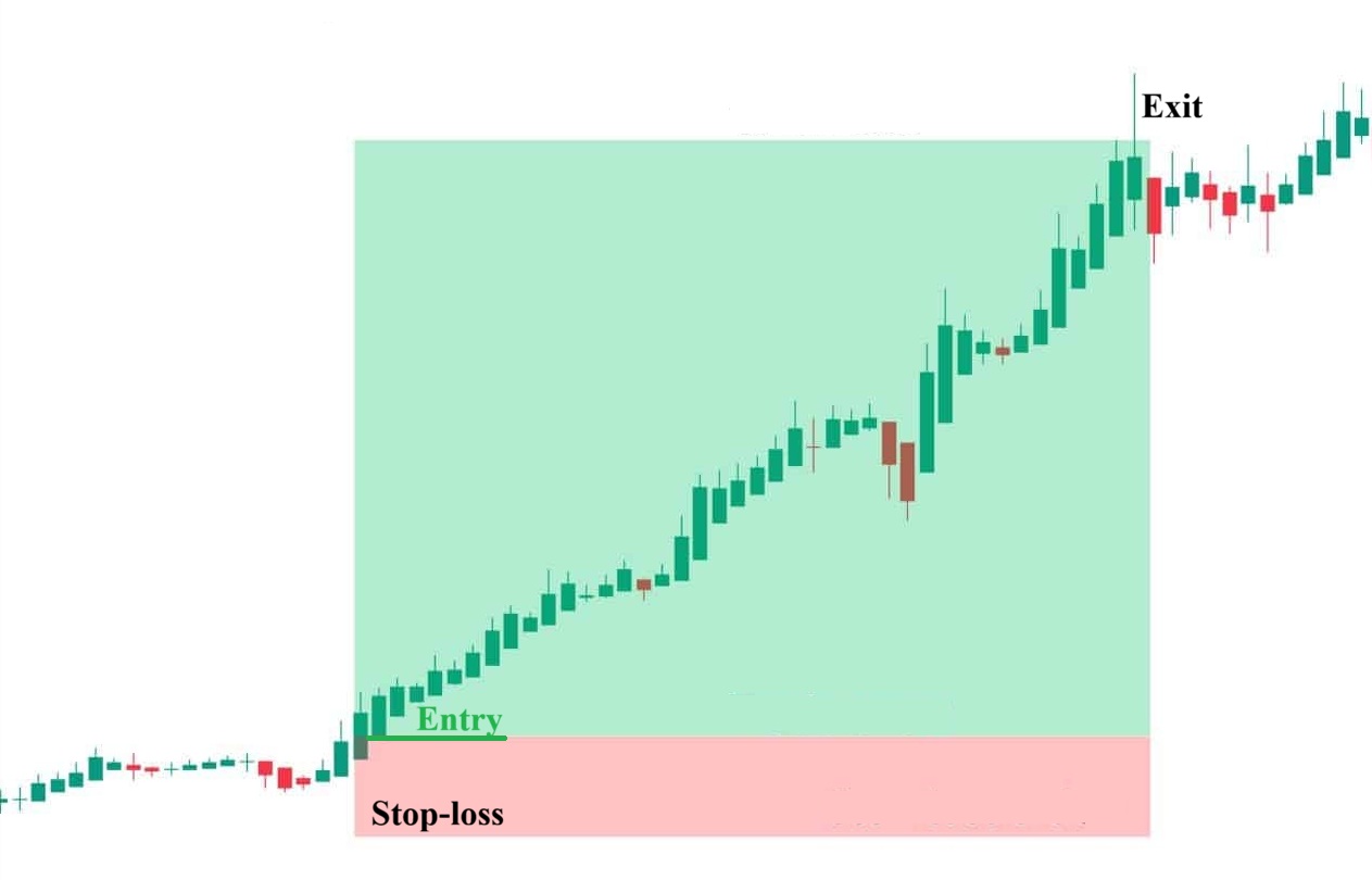 Chiến lược cốt lõi khi sử dụng nến Heikin Ashi là giao dịch thuận theo xu hướng đang hình thành. Khi xuất hiện chuỗi nến tăng liên tiếp với thân dài và hầu như không có bóng dưới, điều đó phản ánh lực mua đang chiếm ưu thế và động lượng tăng được duy trì ổn định. Trong bối cảnh này, trader nên ưu tiên tìm cơ hội mua thay vì cố gắng bắt đỉnh.