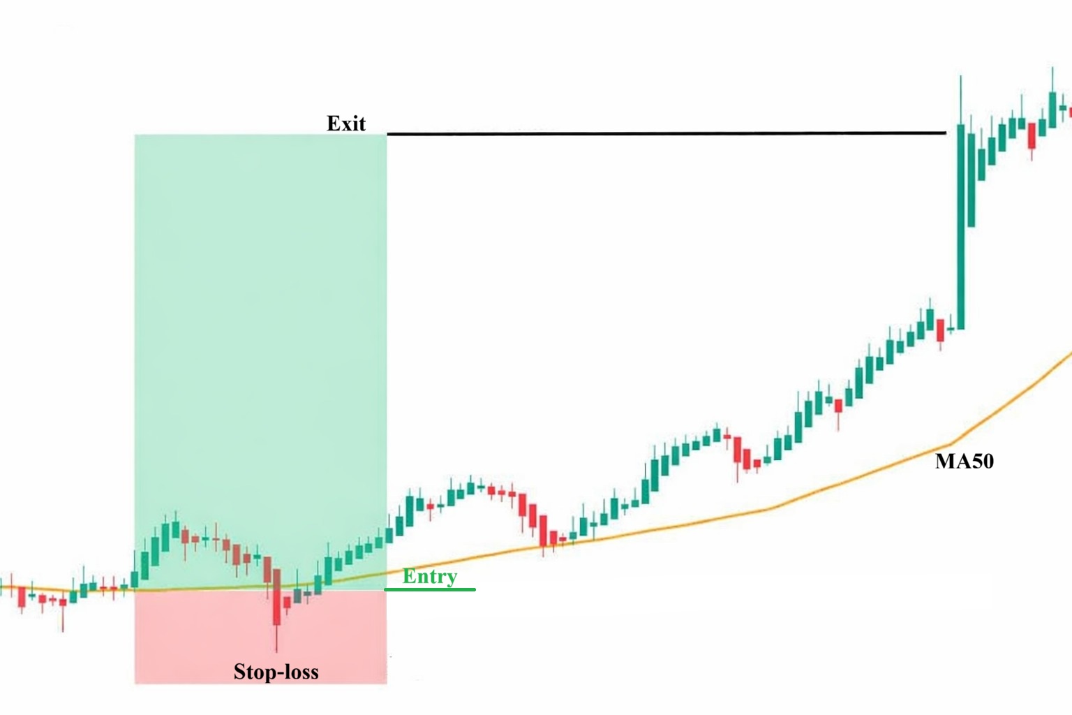 Heikin Ashi hoạt động hiệu quả hơn khi được đặt trong một hệ thống có xác nhận bổ sung từ chỉ báo kỹ thuật. Một cách phổ biến là kết hợp với đường trung bình động như MA50 để xác định hướng xu hướng chính. Khi giá nằm trên EMA và nến Heikin Ashi duy trì chuỗi tăng mạnh, điều này cho thấy xu hướng tăng có nền tảng kỹ thuật rõ ràng hơn.
