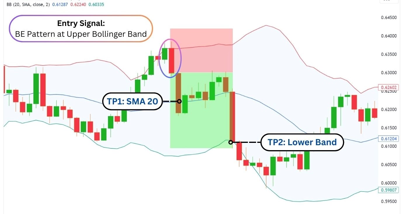 - Tín hiệu bán: Khi giá chạm dải trên và quay đầu xuống, kết hợp với nến Bearish Engulfing, vào lệnh bán.