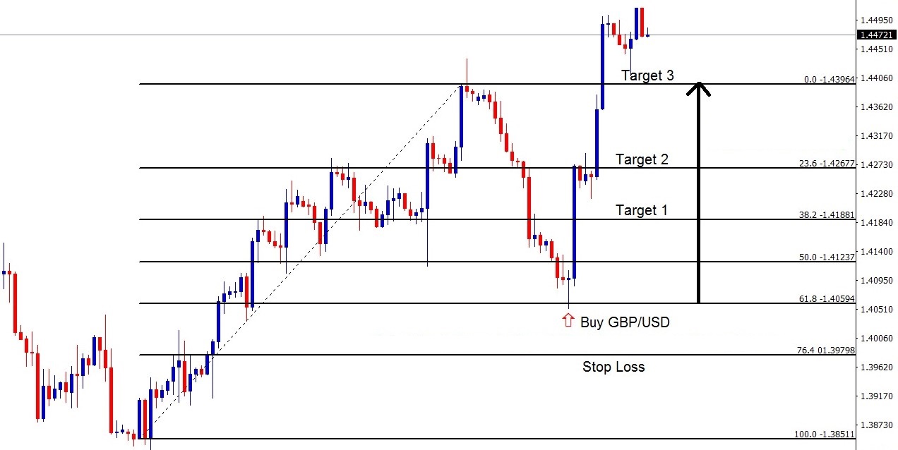- Tín hiệu mua: Khi giá thoái lui về mức 38.2%, 50%, hoặc 61.8% và xuất hiện nến tăng xác nhận (như Bullish Engulfing), vào lệnh mua.