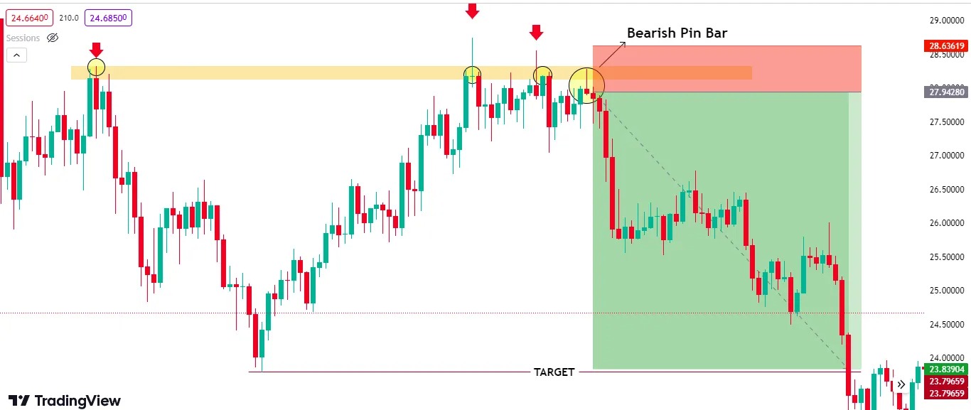 - Tín hiệu bán: Khi xuất hiện Pin Bar giảm (bearish) tại mức kháng cự, vào lệnh bán.