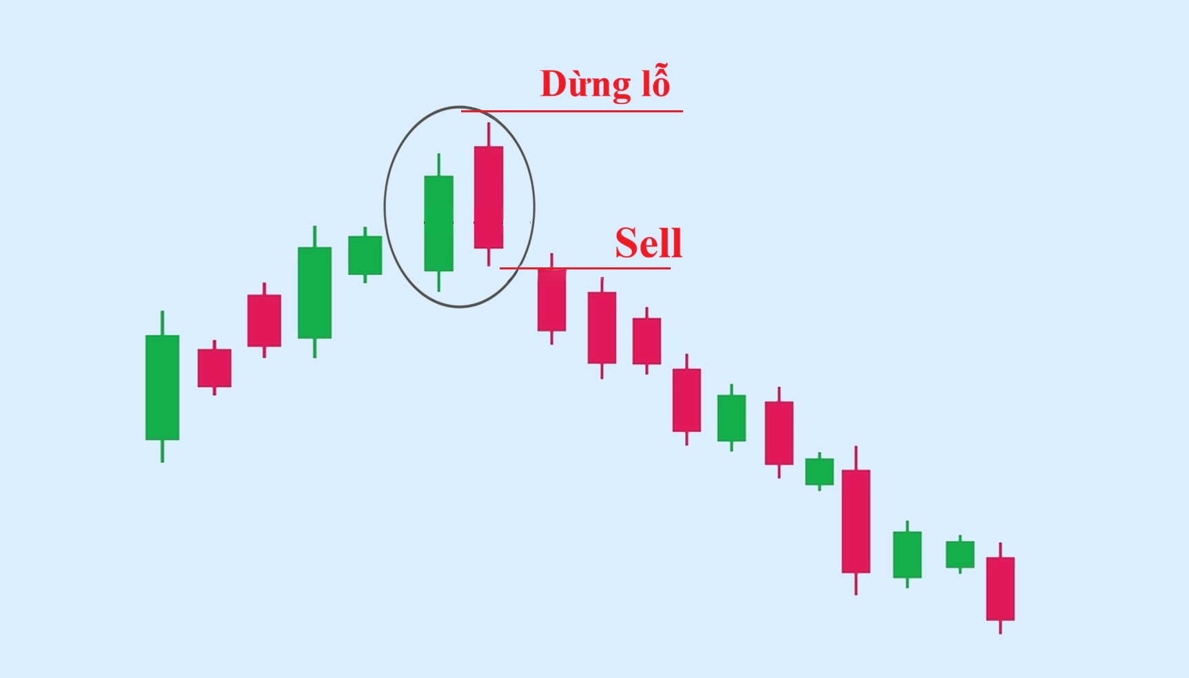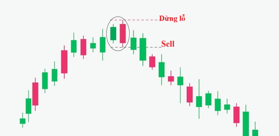 - Cách giao dịch: Chờ giá phá xuống dưới 50% thân nến đầu tiên để mở lệnh bán hoặc chờ xác nhận từ cây nến tiếp theo đóng cửa thấp hơn nến 2 trước để đảm bảo an toàn. Đặt dừng lỗ trên đỉnh mô hình.