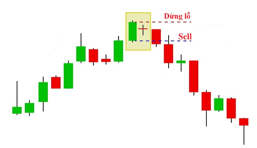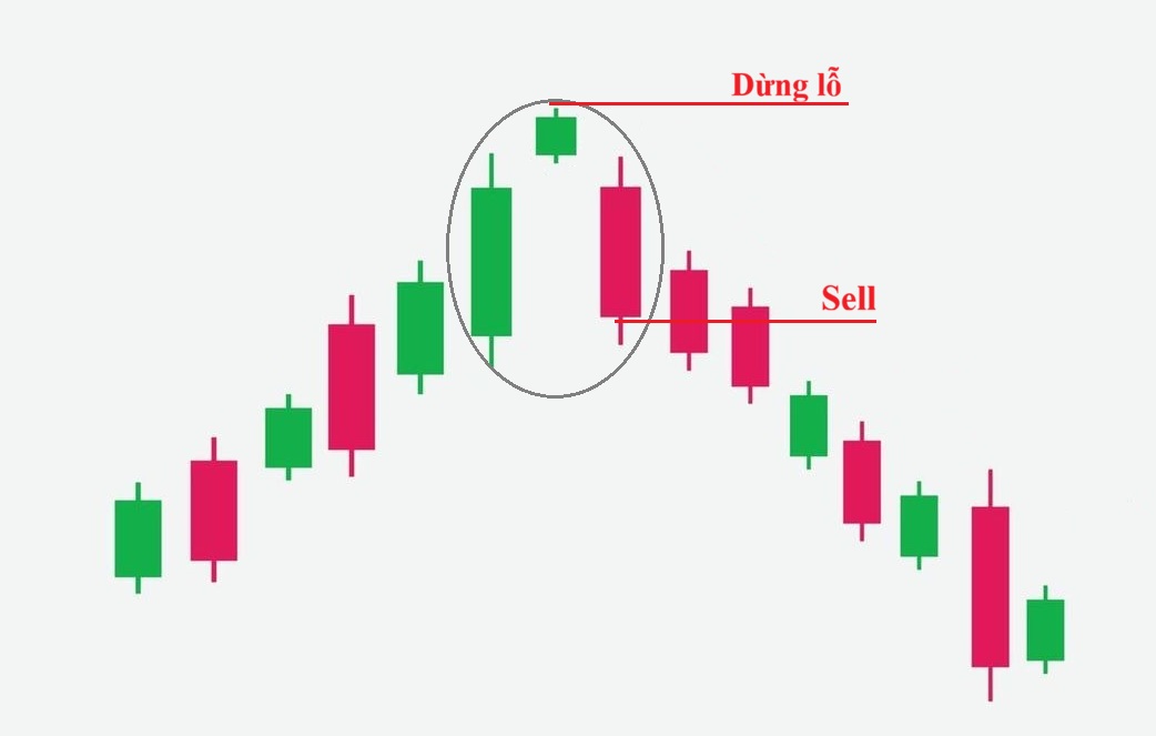 - Cách giao dịch: Đây là tín hiệu cảnh báo sớm để nhà giao dịch bắt đầu thắt chặt dừng lỗ cho các lệnh mua hoặc chuẩn bị kịch bản bán khống. Lệnh Sell chỉ nên được thực hiện khi giá phá vỡ đáy của cây nến mẹ. Dừng lỗ đặt trên vùng thân nến mẹ.